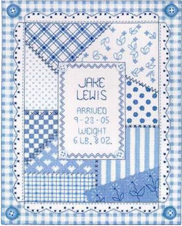 Model stitched on14 ct. White Aida using DMC: 334, 336, 775, 824, 825, 826...- Regular price