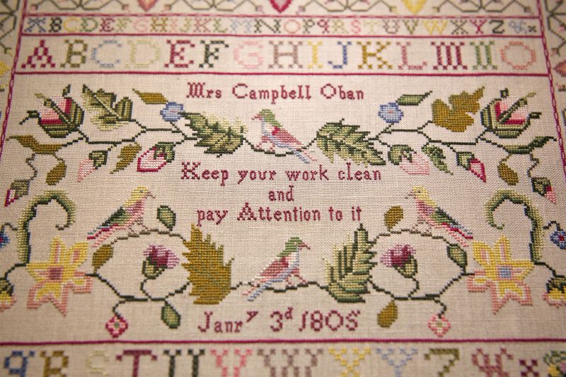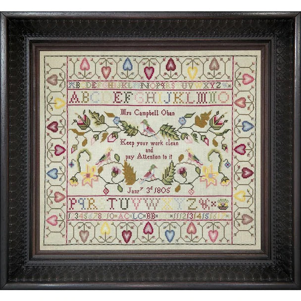 The stitches used are cross stitch over 2 threads of linen, with the dedication over 1 thread of linen, Algerian eyelet, and backstitch.
