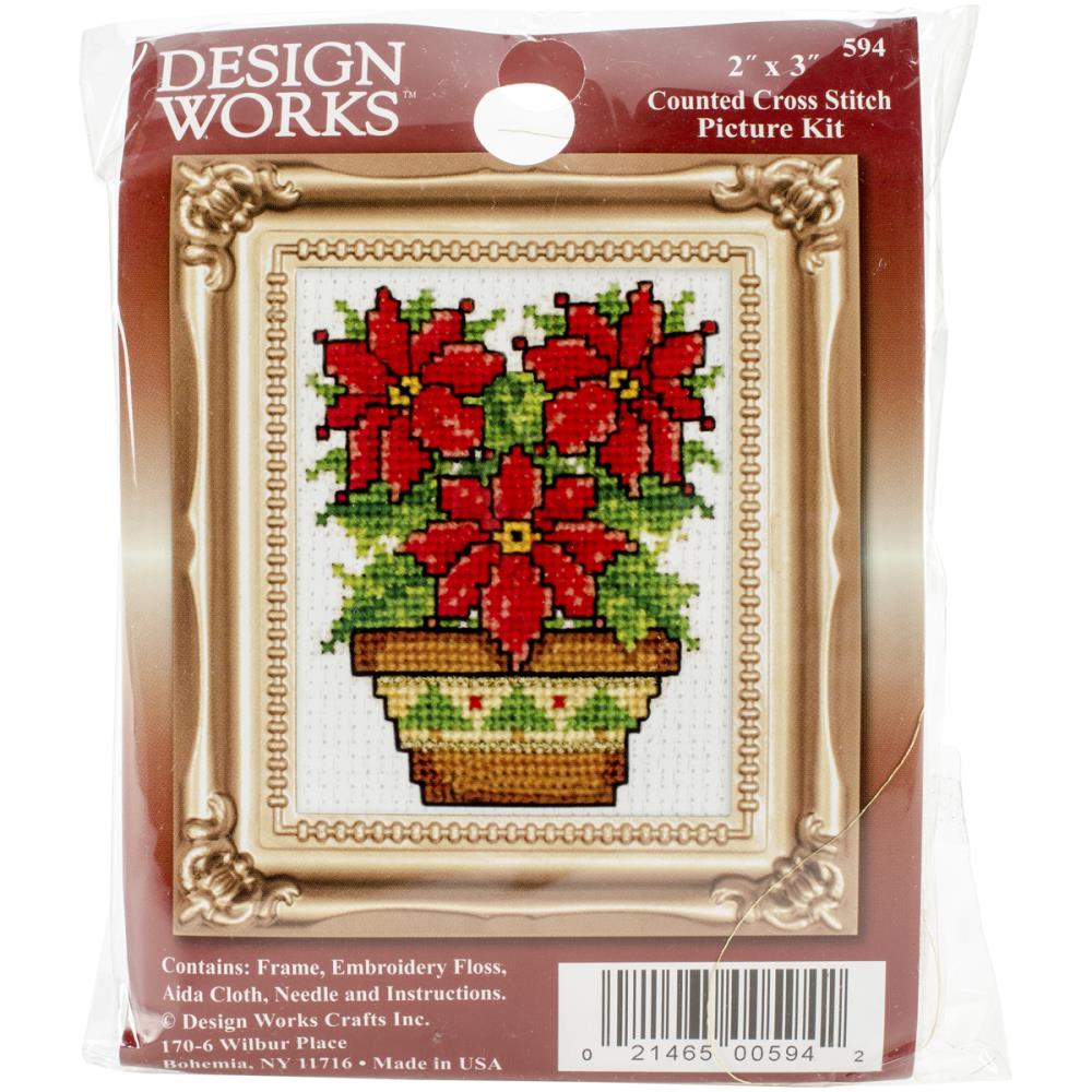 Kit includes one 3" x 2" plastic frame, embroidery floss, Aida cloth, one needle and instructions.
