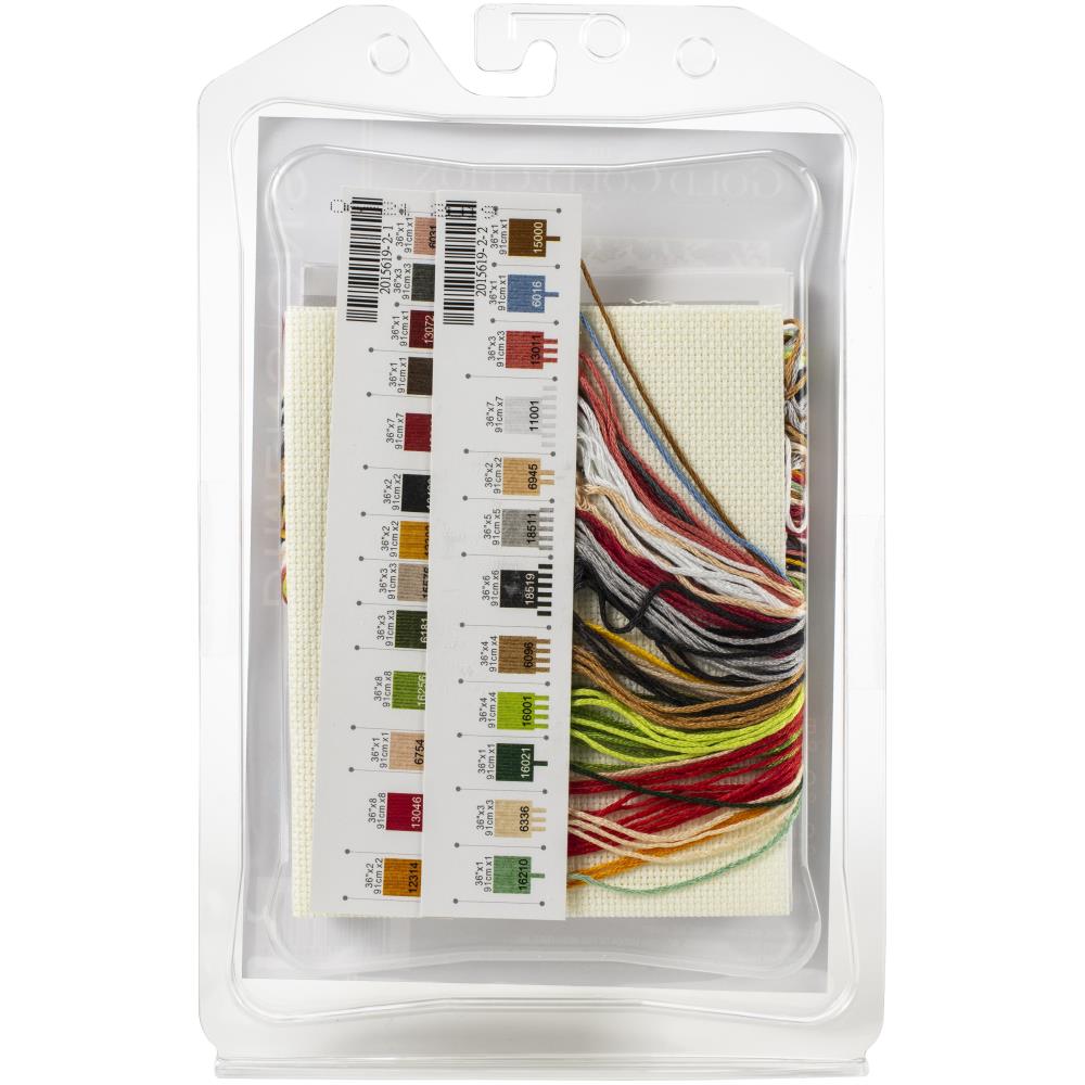 The Gold Collection Kit includes: 18 count ivory Aida, cotton thread, metallic thread, needle, and easy instructions.