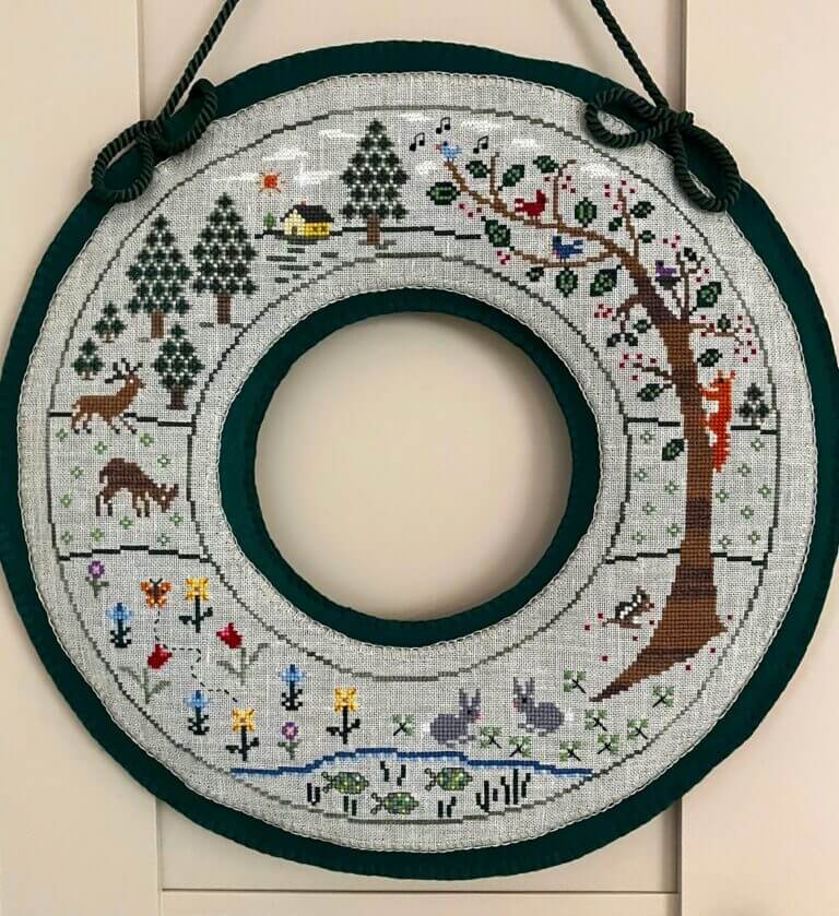 Model stitched on 28 ct. Rustico Natural linen from Wichelt