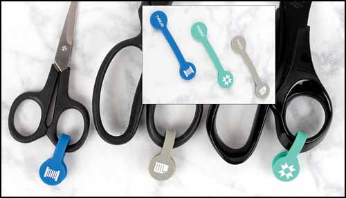 . Magnetic Scissor ID Clips or Tags. Pack of 3. Use these magnetic tags to mark your special scissors for Paper (grey), Thread (blue), or Fabric (green).  Clipped tags are 1¼" long and ½" wide.