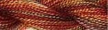 A single strand of hand-dyed cotton in variegated colors. It has more of a matte finish when stitched. It is between a #8 and #12 pearl cotton in weight.