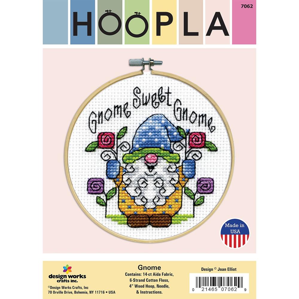 Kit includes 14 count Aida, 100% cotton embroidery floss, one 4-inch embroidery hoop, one needle and fully illustrated chart and instructions.