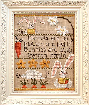 We started carrying Prairie Grove Peddler because of their punchneedle designs, however, we couldn't resist... 'Carrots are Up, Flowers are Poppin, Bunnies are Busy, Garden Hoppin' A cute springtime piece, and with spring right around the corner you will want to  get this stitched now so that when it arrives your sampler is ready to hang.  With the weather we've been having on the East Coast it feels like spring now.  Stitched on 28ct this finishes approx 7 x 9, and is worked in regular DMC flosses. It also presents possibilities for embellishment.