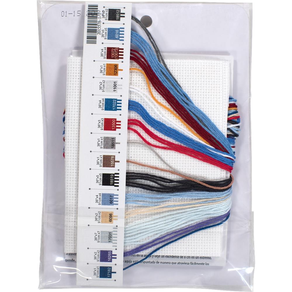 Dimensions "Buidling a Snowman" kit contains 14 Count white Aida, presorted thread, a needle, and instructions.