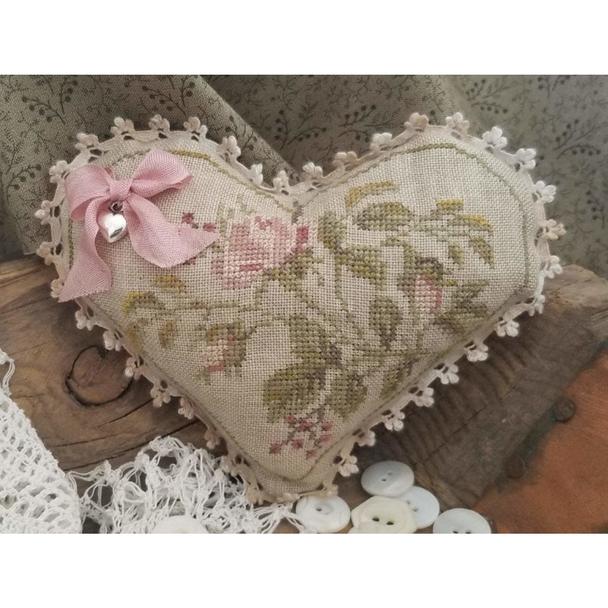 Complete kit which includes all the materials needed to stitched and finish this pinkeep, 36 ct. Weeks Dye Works Beige linen, backing fabric, lace trim, ribbon and a silver heart charm.