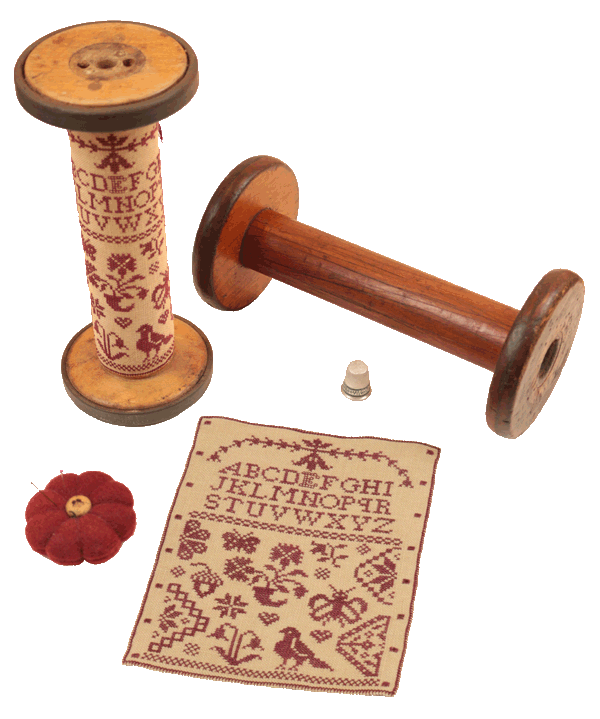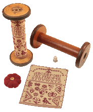 **Stitches Used: cross stitch and backstitch. Four-sided, closed herringbone, and Symrna cross stitches are optional. If attaching your sampler to a bobbin, you will also use eyelet and nun’s stitches.Stitch diagrams, detailed stitching directions, and bobbin assembly directions are provided.