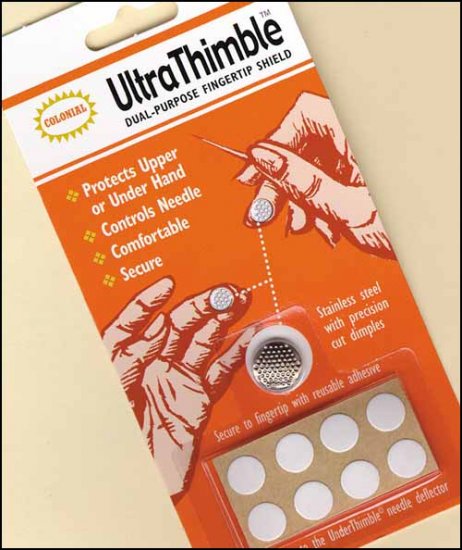 Colonial's ultimate thimble! Stainless steel fingertip shield with precision-cut dimples for great needle control. Attach to upper pushing or under deflecting fingers with reusable adhesive dots. One thimble and eight adhesive dots per package