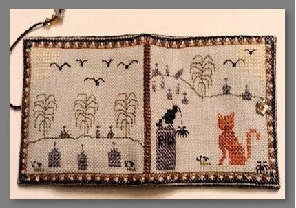 Kit includes, 32 Ct Zwiegart Belfast linen, pearl gray, Radiant Waves cotton quilt fabric, black and gray, fusible interfacing, instructions and charts, #26 tapestry needle. Also included, The Thread Gatherer SNC (1), Weeks Dye Works (5), Hannah Silk Ribbon "Stonehenge", Glass Flower Beads, Swarovski Crystals, Delica Beads and Spider Charm.