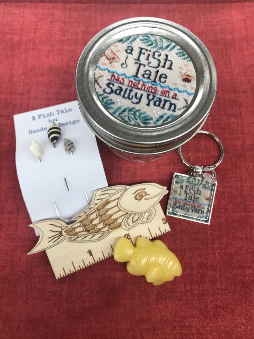 The exclusive kit includes the chart, a wooden divided box for displaying the pieces, 14 weeks dye works threads, a fat quarter of linen, trims, wool for the pincushion top, and the red backing fabric. Also included is the matboard, cardboard, foam core, ribbon, trim, and twine for finishing. There are some extras that were made to fill your box... a custom fish ruler by Joseph's Workshop, a set of real shells made into counting pins, a thread keep by Sampling of Memories, a fish waxer by Noteworthy Needle, and an ort jar. The only things that you will need to supply are the white paint for the box, batting, and roving/walnut shells for the pincushion. Since this is an exclusive kit, it will be excluded from any store sales or coupons.