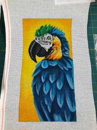 Hand Painted 18 ct. Bruce the Blue Parrot needlepoint canvas. Approx. finished size is 11 3/4" x 6"