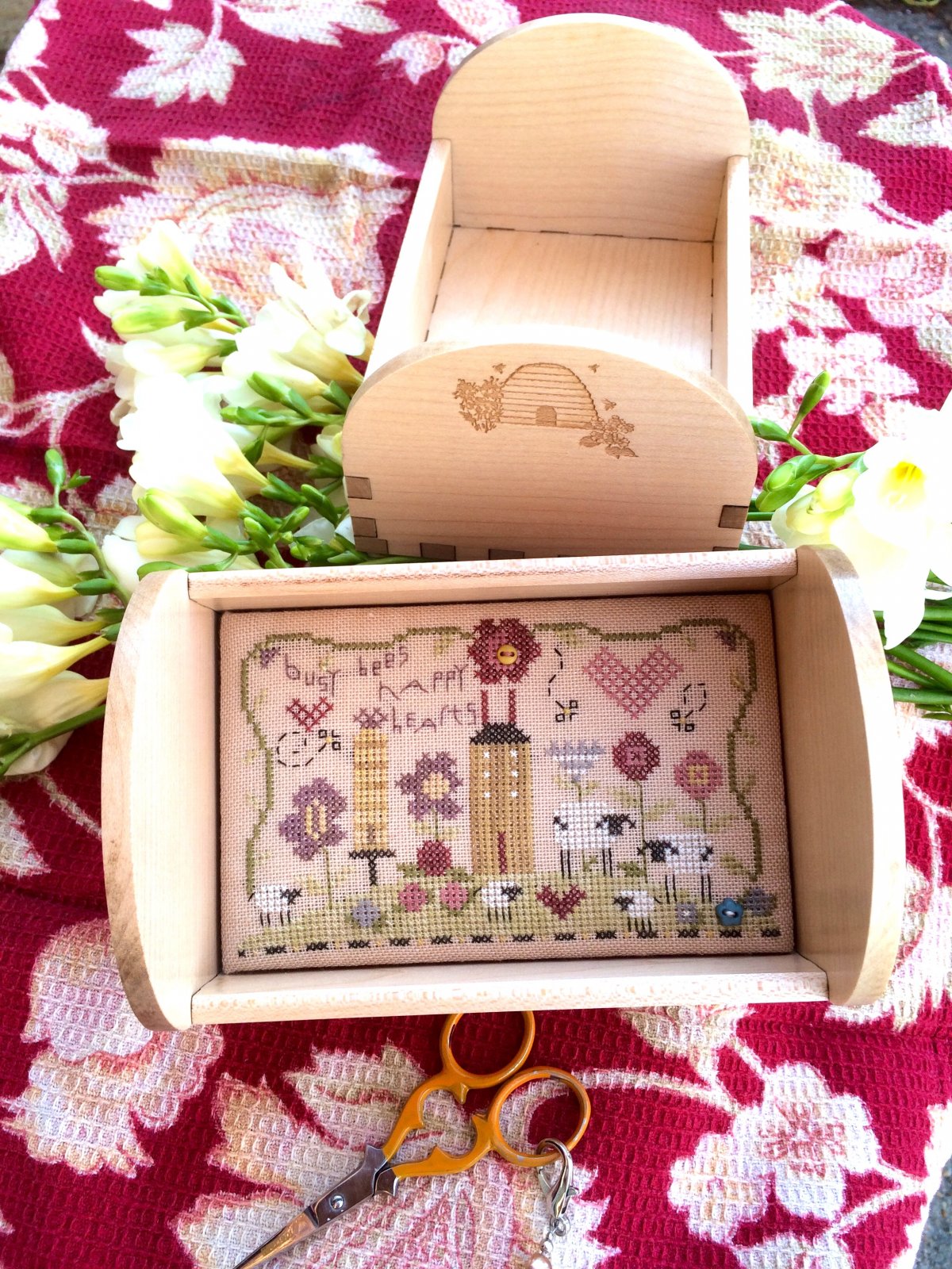 Kit includes 32 ct. French Country Mocha Belfast linen, Weeks Dye Works floss, a set of little buttons especially for this piece, chart with instructions, and a needle.