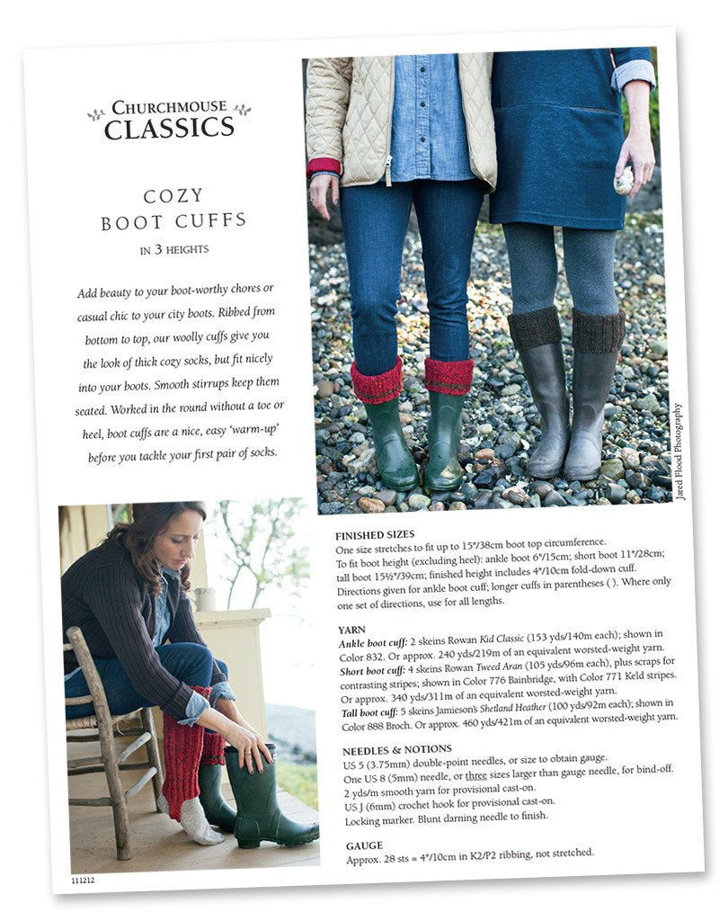 Ribbed from top to bottom, our woolly cuffs give you the look of thick cozy socks, but fit nicely into your boots. Smooth stirrups keep them seated. Worked in the round, boot cuffs are a nice, easy 'warm-up' before you tackle your first pair of socks.