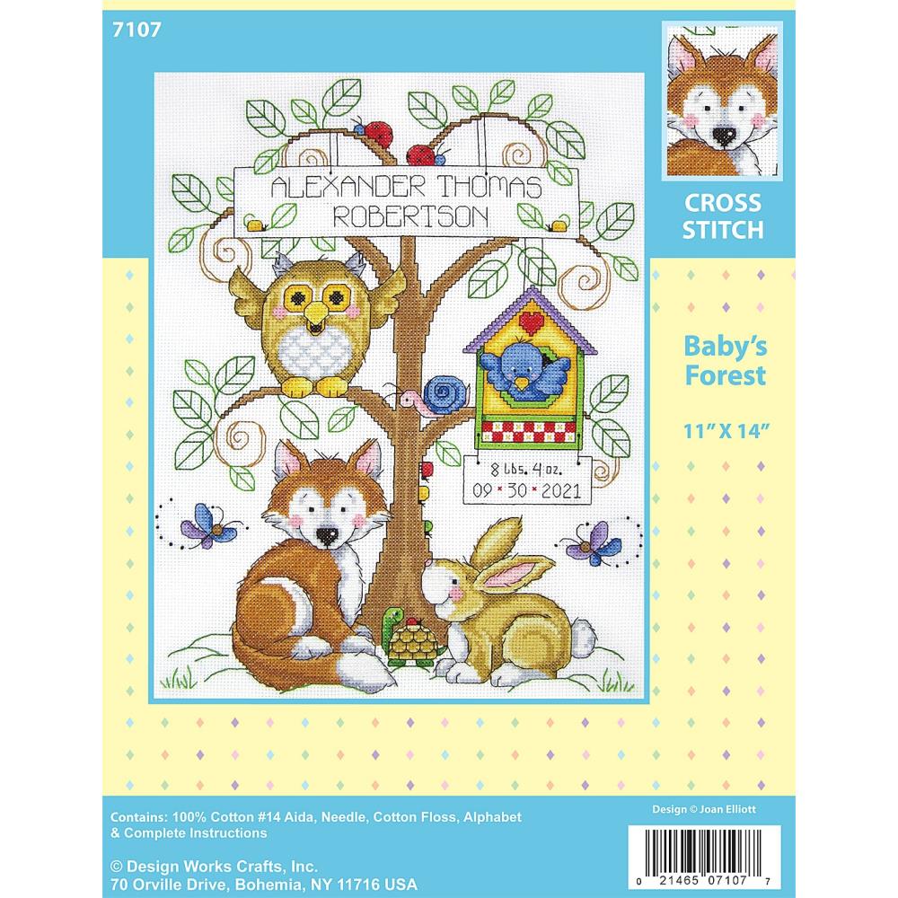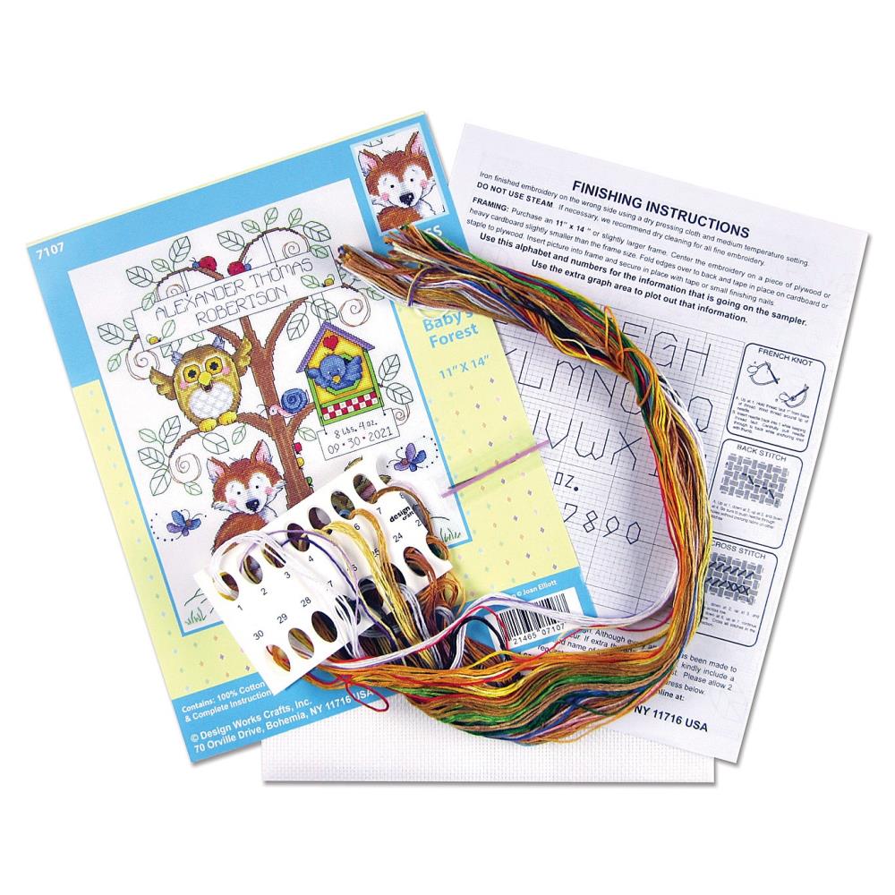 Kit includes 14 count Aida, 100% cotton embroidery floss, one needle, alphabet and numbers for personalization, and fully illustrated chart and instructions.