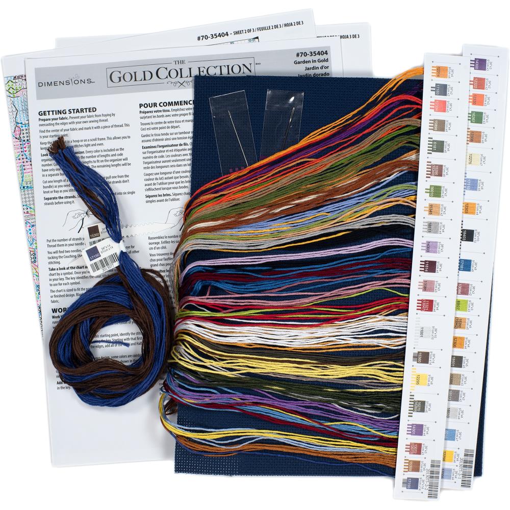 Dimensions kit contains presorted thread, 14 count navy Aida, needles, and instructions.