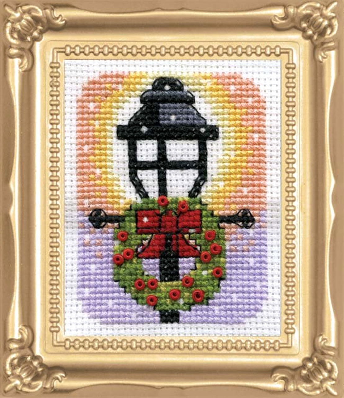 Kit includes 14 count Aida, 100% cotton embroidery floss, needle and fully illustrated instructions and plastic gold frame