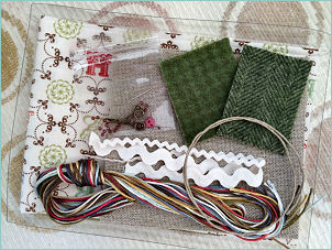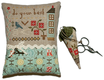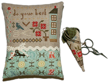 Kit includes 30 ct. Natural Linen for main project, alphabet finishing fabric for front and back (assorted colors), Weeks Dye Works overdyed thread pack, 2 sizes of ivory rick rack, hand-dyed flower button, antique gold stork scissor charm, and needle. The bonus design is a sweet, skinny strawberry fob. They've included 2 pieces of WDW hand-dyed wool (herringbone and check green) for the berry leaves, rusty red beads and even rustic twine to finish off your berry.