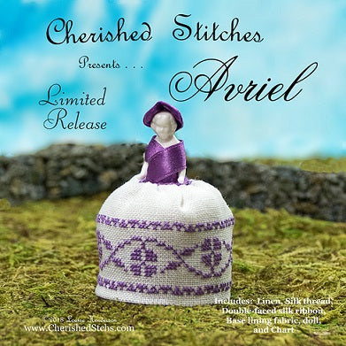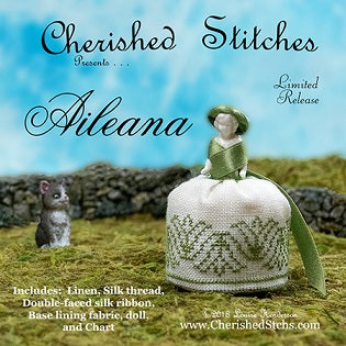 Kit includes 36 ct.  White linen, NPI silk floss, silk ribbon, base lining fabric, and a doll .  Complete directions for finishing are included.  Finished pincushion is approx. 2" tall.