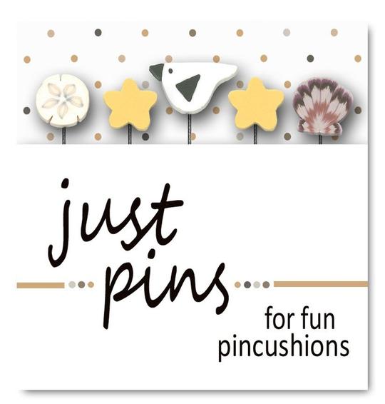 Straight pins topped with classic button images, wear one or stick a few in a pin cushion - packaged in the pictured assortments of five pins