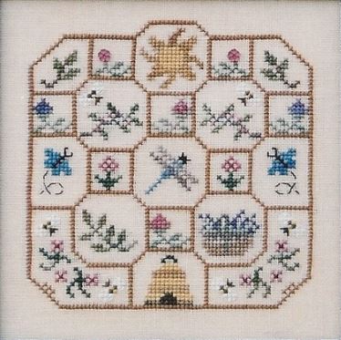 A border of tarnished gold accents summer motifs such as a basket of lavender, a dragonfly and pink flowers. A bee skep is stitched at the bottom of the pattern along with a number of bees and butterflies.  Mill Hill Treasures add a lovely accent to the two flowers at the top of the pattern.