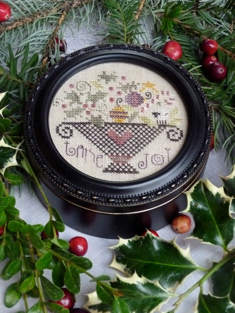 Take Joy kit includes 30 count hand-dyed linen, silk thread., chart w/instructions and a needle.
